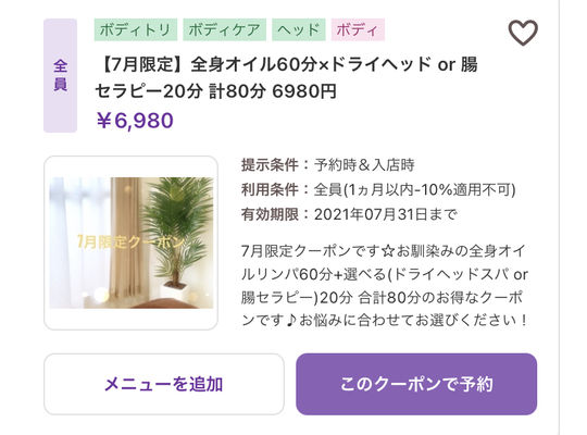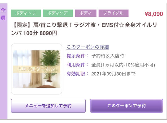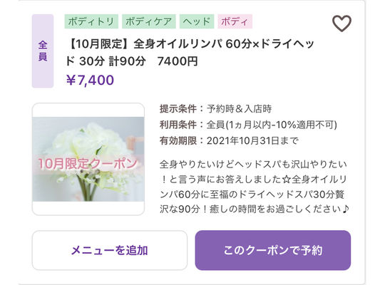 2021/10/11こんにちは♪ いつもプライベートサロンPlaisirをご利用頂き ありがとうございます^^ 10月の限定クーポンをご紹介致します!! 大人気の組... -